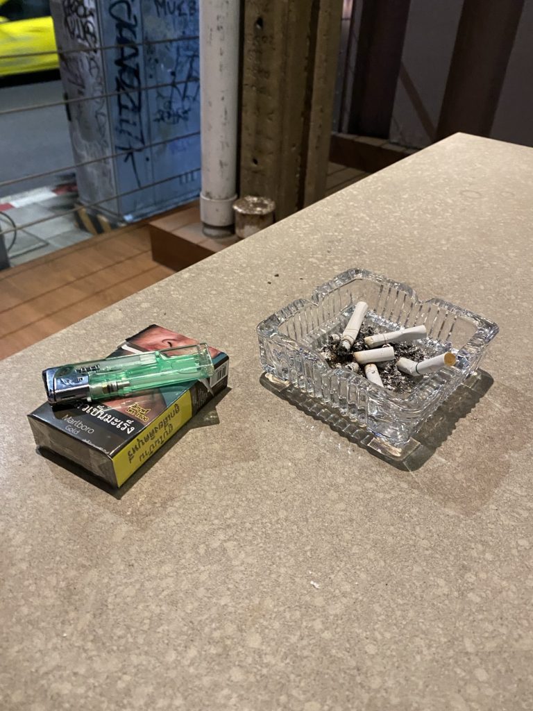 ですが、ホテルの入り口のバルコニーには椅子と机があり灰皿もありました。